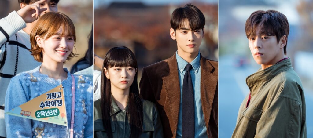 The released stills show Seo Won and Ji Ah standing side by side, Han Hae Na smiling brightly while holding a the school trip banner, and Bo Gyeom staring at someone with a frosty expression.