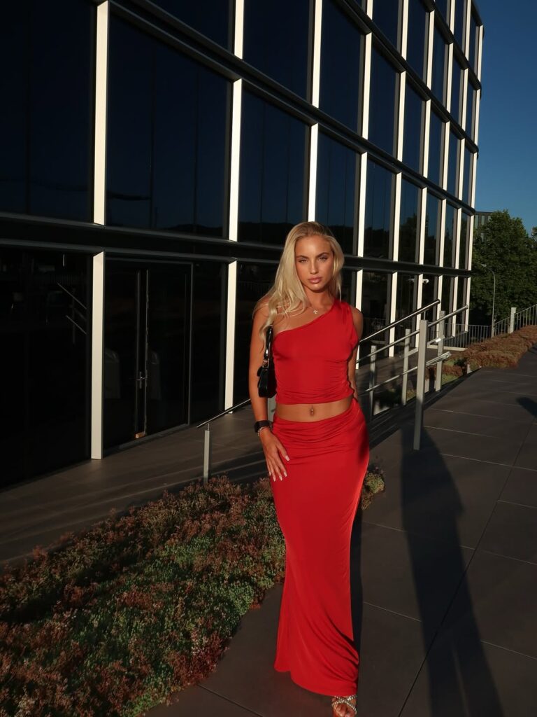 The outfit—a form-fitting two-piece set in vibrant crimson—embraced minimalism while still exuding sophistication and allure. Her long blonde waves flowed down her back, catching the golden hour light just right, adding to the dramatic aesthetic of the shoot.