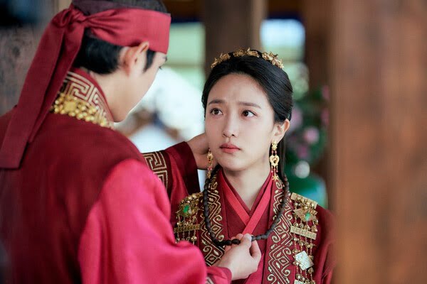 The released stills show the wedding scene of Do Ha (Kim Young Dae) and Han Ri Ta (Pyo Ye Jin). First, we see the couple dressed up in their wedding attire under the glorious sunshine. Do Ha and Han Ri Ta are beautifully dressed in traditional Silla wedding clothes, with red fabrics and colourful gold ornaments.